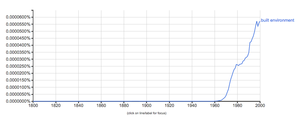 Finalmente, testando a expressão “ambiente construído”, somos apresentados à imagem abaixo. A explosão de uso desta expressão acompanha o crescimento do interesse por “ambiente” ao longo dos anos 1960 e 1970, apresentando apenas uma leve queda em meados dos anos 1990.