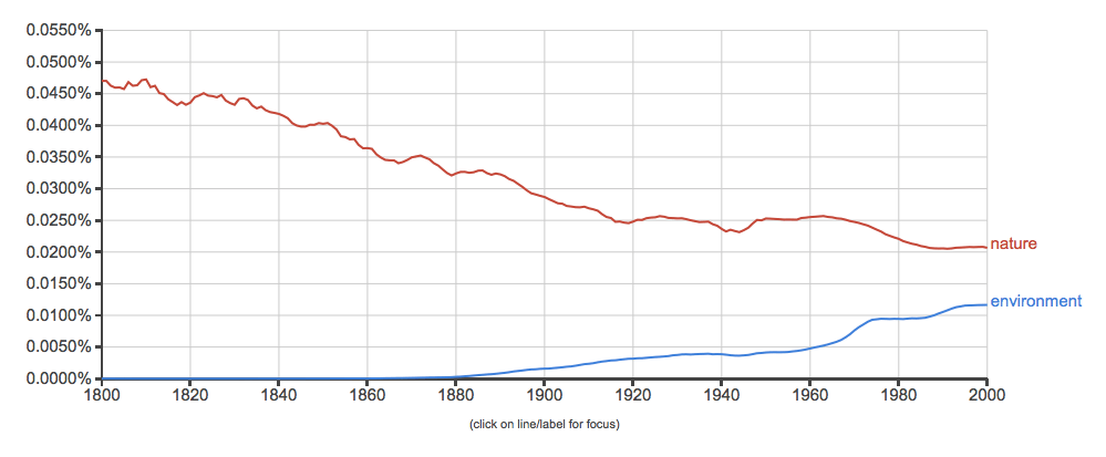 Quando a palavra “nature” é analisada junto de “environment”, é gerado o surpreendente gráfico abaixo, quase sugerindo um certo desconforto contemporâneo com “natureza” e sua gradual substituição por “ambiente”.