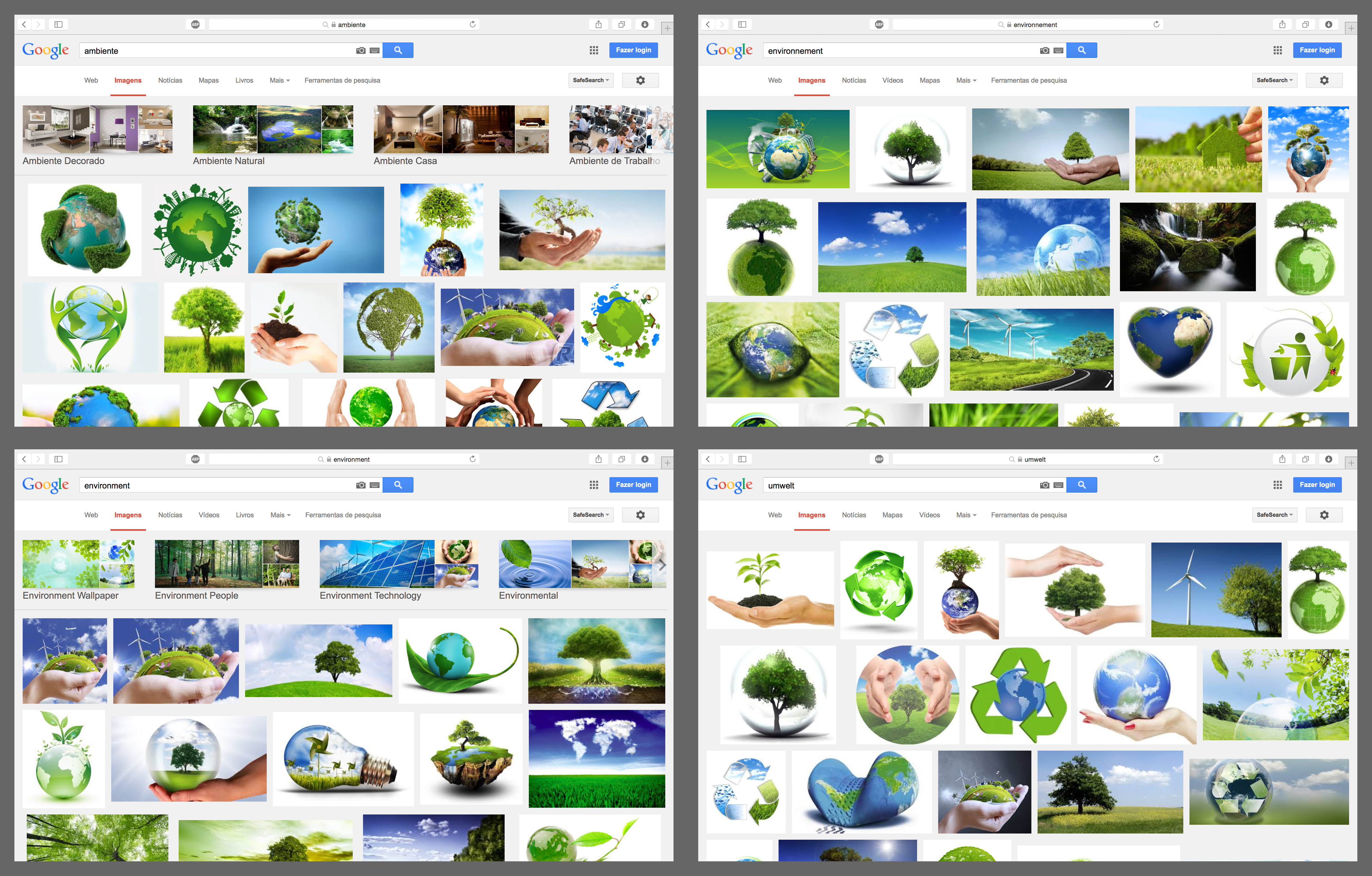 Um caso curioso é o da relação estabelecida entre as noções de “ambiente” e “Terra”, já praticamente naturalizada: uma breve pesquisa no Google Imagens revela o quanto aquela representação da Terra popularizada com as imagens da NASA nos anos 1960 tem sido trabalhada e retrabalhada a ponto de frequentar o imaginário ambiental cotidiano, como as pesquisas abaixo revelam nos mais variados idiomas.