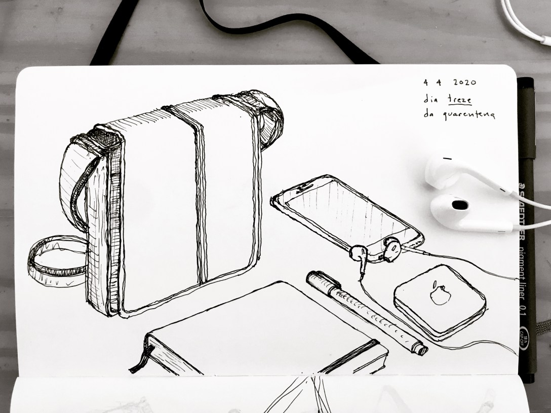 Nestes tempos de confinamento, a bolsa permanece agora solitária e recolhida em algum canto de meu quarto de estudos. Desenhar todos os dias (ou quase) tem sido um exercício interessante para substituir a rotina cotidiana interrompida.