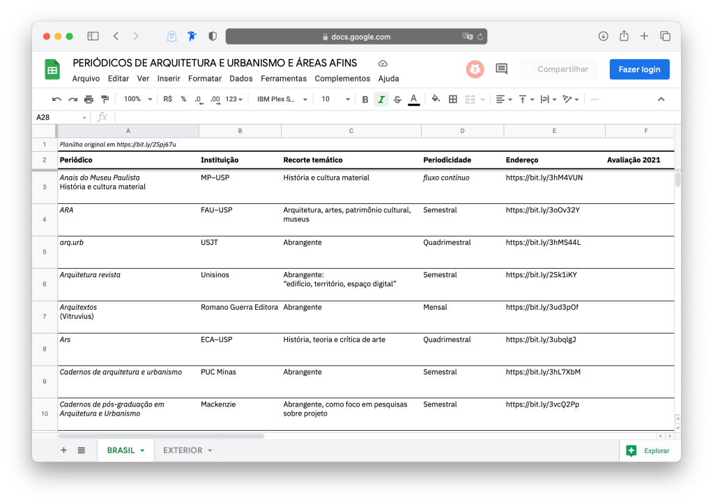Em função disso, produzi uma lista com cerca de 20 periódicos nacionais interessantes ligados ao campo da arquitetura e urbanismo e áreas afins. A planilha está no Google Sheets e pode ser editada livremente. Fica, portanto, aberta à colaboração. 🙂