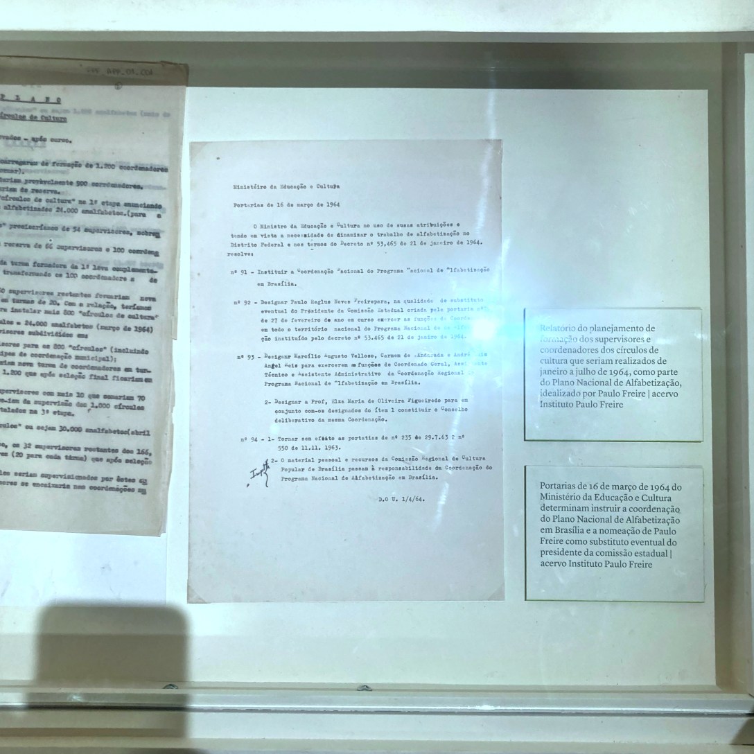 O documento exposto na Ocupação — aquele contendo a portaria do dia 16 de março que apontava Paulo Freire como coordenador nacional de alfabetização —, indica também a data de sua publicação no Diário Oficial: o mesmo 1º de abril de 1964. É significativo que a data escolhida por empresários e militares para derrubarem a democracia brasileira e instaurarem aquele regime de ódio e violência que duraria 21 anos tenha sido justamente o dia em que Freire iniciaria seu projeto de alfabetização do país.