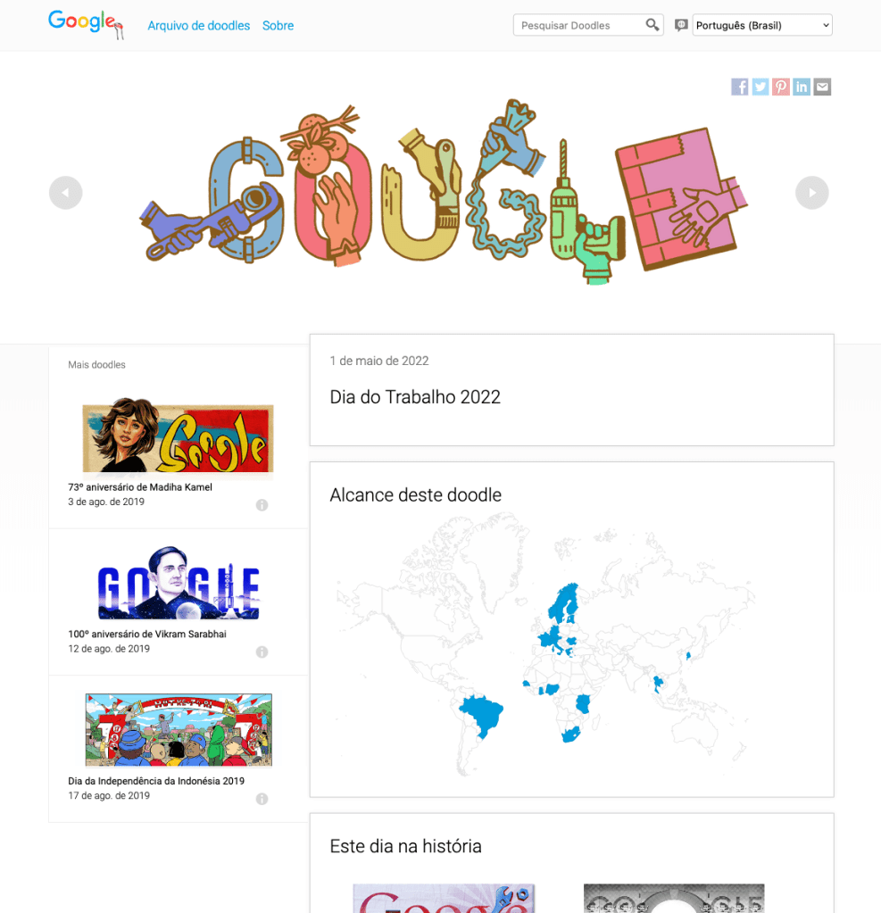 Este doodle apareceu apenas em um conjunto limitado de países, conforme demonstra a página ilustrada acima: nas Américas apareceu exclusivamente no Brasil. Na Ásia ele aparece na Tailândia e na Coreia do Sul. Na África aparece em sete países e na Europa em mais de dez — trata-se do continente em que a data foi mais comemorada pela empresa. Sou bastante ignorante a respeito do contexto africano e asiático, mas não deixa de ser curioso que o 1º de maio tenha sido comemorado sobretudo em países onde há um estado de bem estar-social consolidado — e, portanto, onde há movimentos sindicais fortalecidos e onde os direitos trabalhistas estão razoavelmente assegurados.