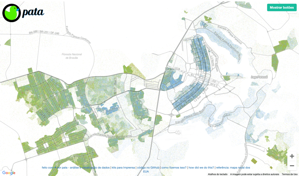 A segregação sócio-espacial do Distrito Federal fica bastante evidente neste mapa de distribuição racial: a área do Plano Piloto é predominantemente branca, diferente das demais regiões administrativas.