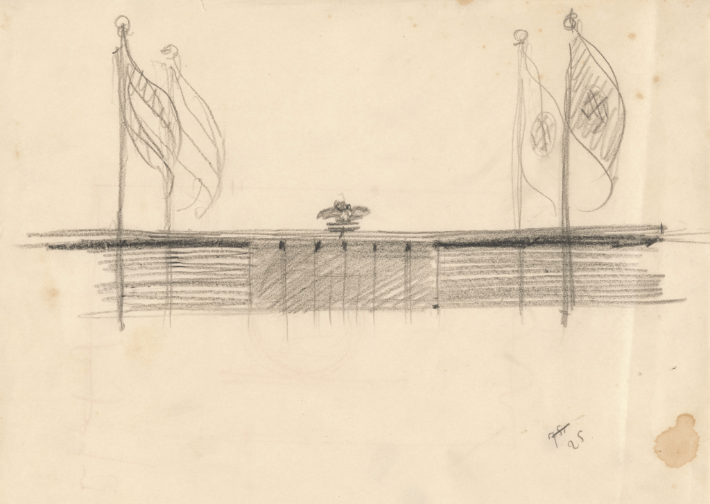 Longe aqui de querer fazer qualquer papel de advogado do diabo (até porque meu interesse pelo assunto é superficial e não tenho autoridade acadêmica nenhuma sobre ele), mas seria talvez este desenho a expressão desesperada de alguém que se viu obrigado a aderir ao pesadelo nazista? Sugerir isto, por outro lado, talvez seja generoso demais da nossa parte, dados outros episódios de colaboração mais explícita do arquiteto com o regime — como aponta um já clássico texto de Celina Welch, de 1993.