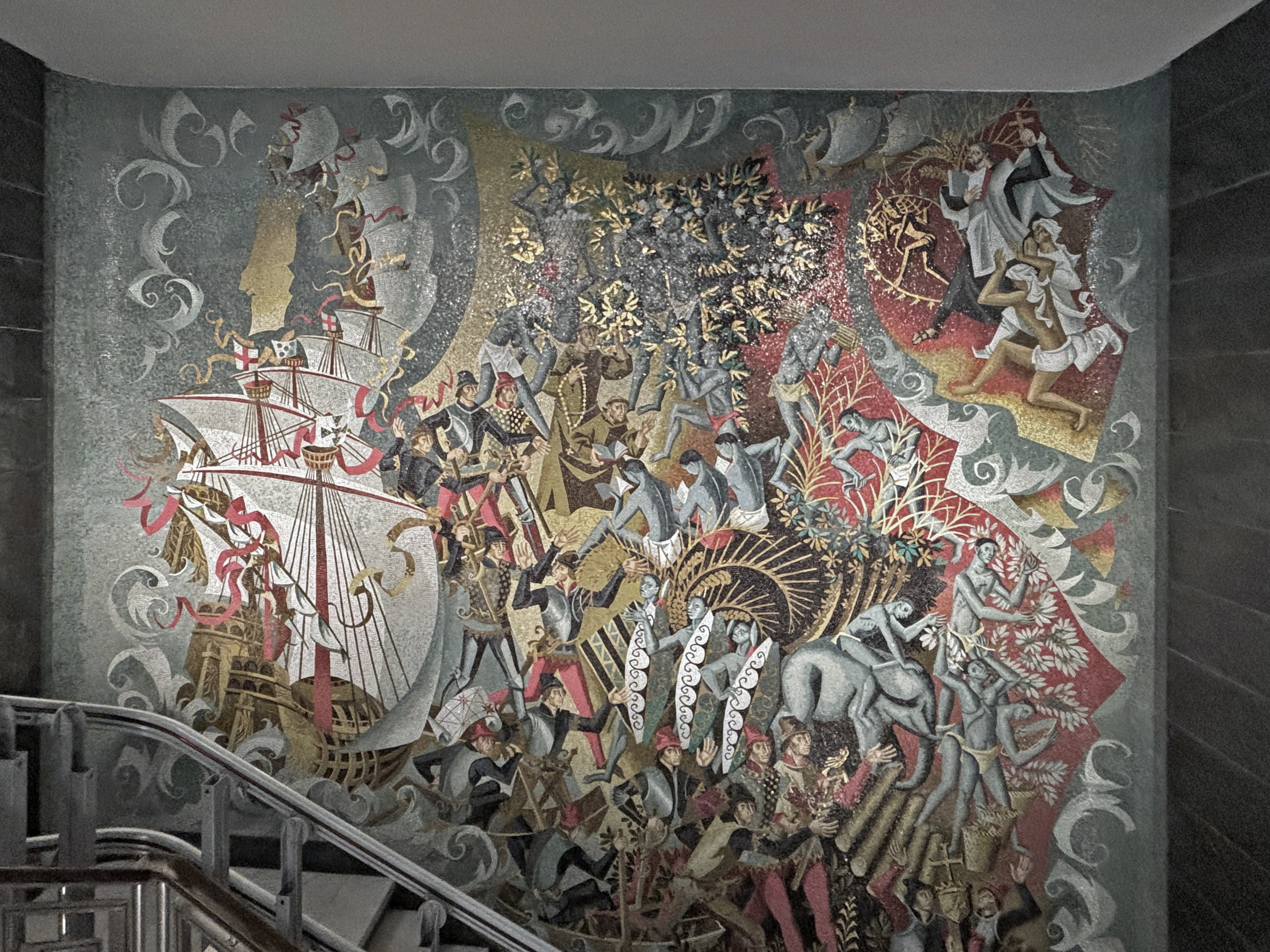 O Banco Nacional Ultramarino atuava nas antigas colônias portuguesas localizadas na África e na Ásia — era, portanto, ele próprio uma das engrenagens da violência colonial. A fachada do edifício explicita o orgulho colonial lusitano por meio de ornamentos alusivos ao empreendimento colonial, como caravelas e brasões. No entanto, é no interior do edifício que o culto à violência colonial se revela mais problemático na medida em que ela não é sequer reconhecida ou comentada: logo à esquerda de quem entra no edifício encontra-se uma escadaria adornada por um enorme mural de mosaico. Nele, a dominação dos povos nativos das terras invadidas pelo Império Português é celebrada de forma explícita.