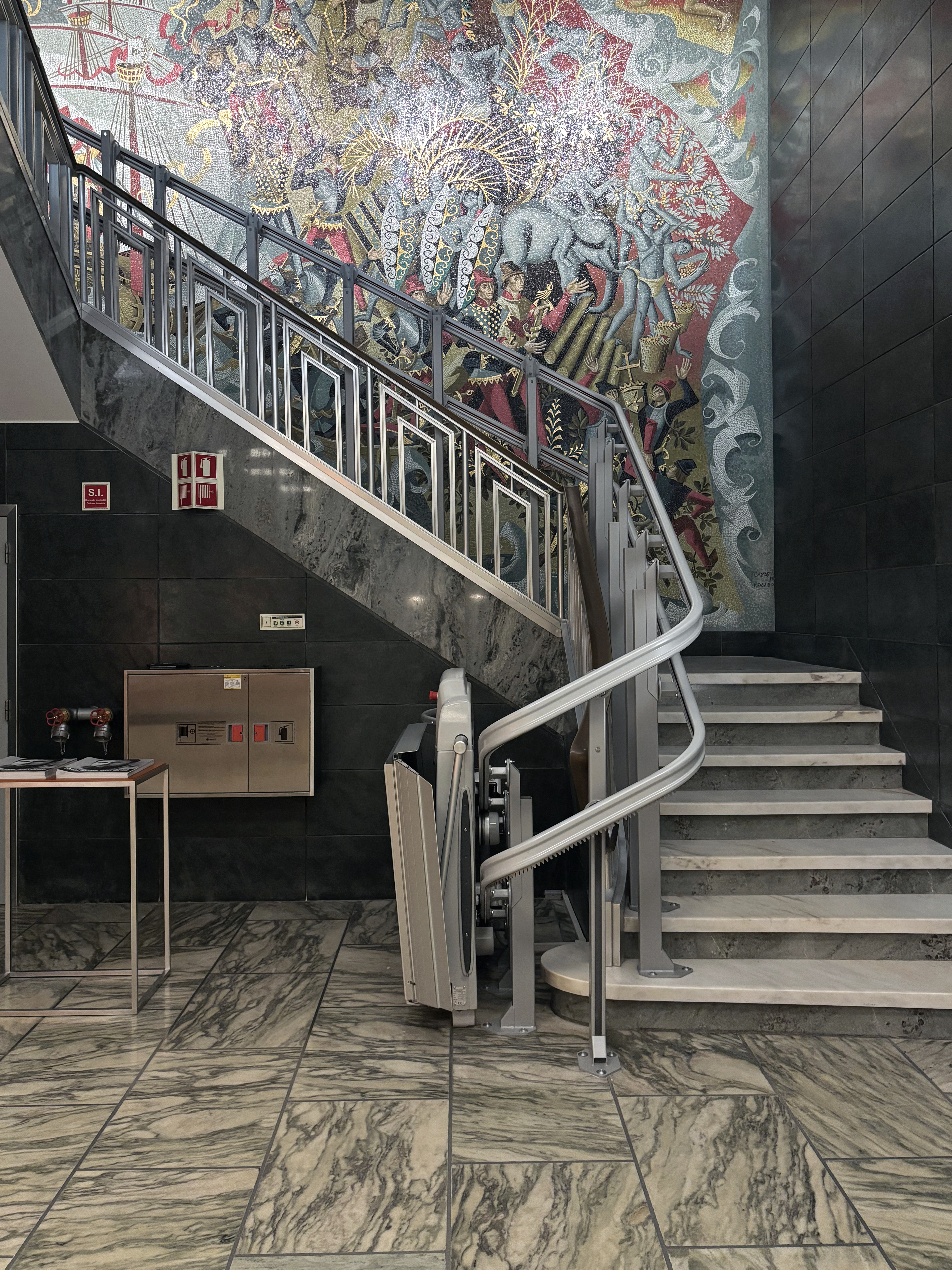 Esta escadaria dá acesso ao espaço expositivo localizado no subsolo, onde, ao que tudo indica, costumam ocorrer exposições temporárias. No local encontra-se o antigo cofre do banco, engenhosamente transformado em espaço expositivo, de forma similar ao que ocorre na filial paulistana do Centro Cultural Banco do Brasil — diferente do CCBB, contudo, este espaço não foi transformado em cubo branco, mantendo sua antiga configuração e a incorporando à infraestrutura expositiva. Trata-se, portanto, de uma grata surpresa para o visitante, não fosse a desagradável passagem pelo mosaico laudatório da violência colonial.